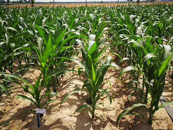 特征特性: 生育期101天,比对照郑单958早熟1天;株高268cm,穗位高110cm,穗长17.4cm,穗行数16~18行,穗轴红色;籽粒黄色,粒型半马齿,百粒重32.5g;